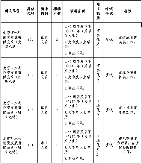 龙岩市水利投资发展有限公司为龙岩投资发展集团有限公司所属全资子公司。龙岩市水利投资发展有限公司管理大灌电站、矶头电站、仁坂电站等7家水电站。现因工作需要,向社会公开招聘6名电站市场化用工工作人员,其中大灌电站运行人员2名,矶头电站运行人员2名、水工1名,仁坂电站运行人员1名。具体如下: