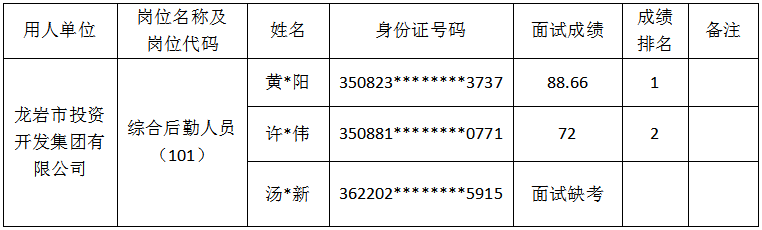 根据2026年3月12日发布的《龙岩市投资开发集团有限公司公开招聘市场化用工工作人员的公告》有关要求,龙岩市投资开发集团有限公司市场化用工岗位综合后勤人员(岗位代码101)考试(面试)环节已组织完成,现将总成绩(面试成绩)排名予以公示如下: