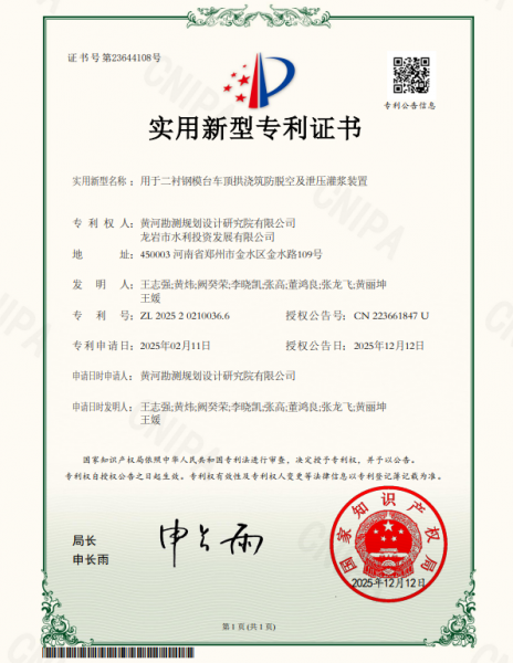 近日,水投公司与黄河勘测规划设计研究院有限公司联合研发的用于二衬钢模台车顶拱浇筑防脱空及泄压灌浆装置成功获得国家实用新型专利授权(专利号:ZL202520210036.6)。专利聚焦水
