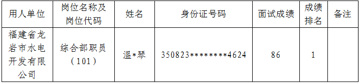 根据2026年3月12日发布的《福建省龙岩市水电开发有限公司公开招聘市场化用工工作人员的公告》和2026年3月24日发布的《福建省龙岩市水电开发有限公司公开招聘市场化用工工作人员调整资格条件延期报名的补充公告》有关要求,福建省龙岩市水电开发有限公司市场化用工岗位综合部职员(岗位代码101)考试(面试)环节已组织完成,现将总成绩(面试成绩)排名予以公示如下:
