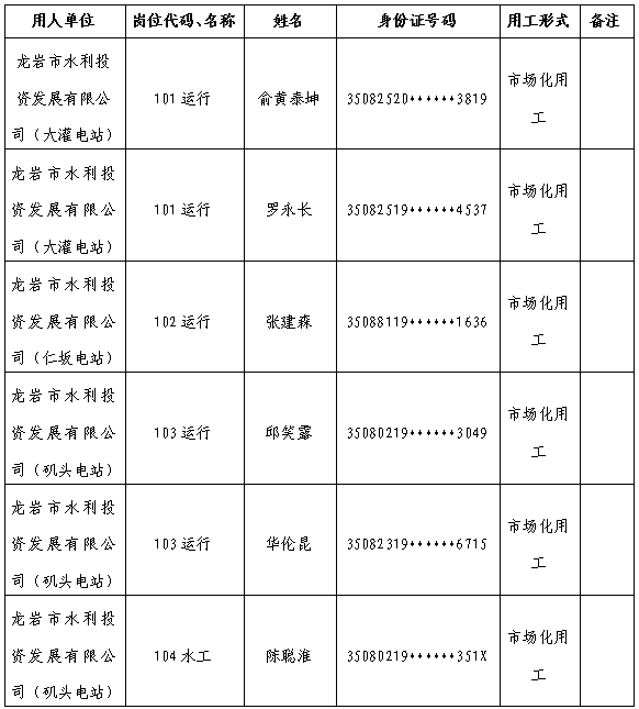 根据3月12日发布的《龙岩市水利投资发展有限公司关于部分所属公司公开招聘市场化用工工作人员的公告》有关要求,经报名、资格审查、组织考试(面试)、体检、政审考察等程序,现将大灌电站、仁坂电站、矶头电站运行和水工等4个岗位拟录用人员名单公示如下: